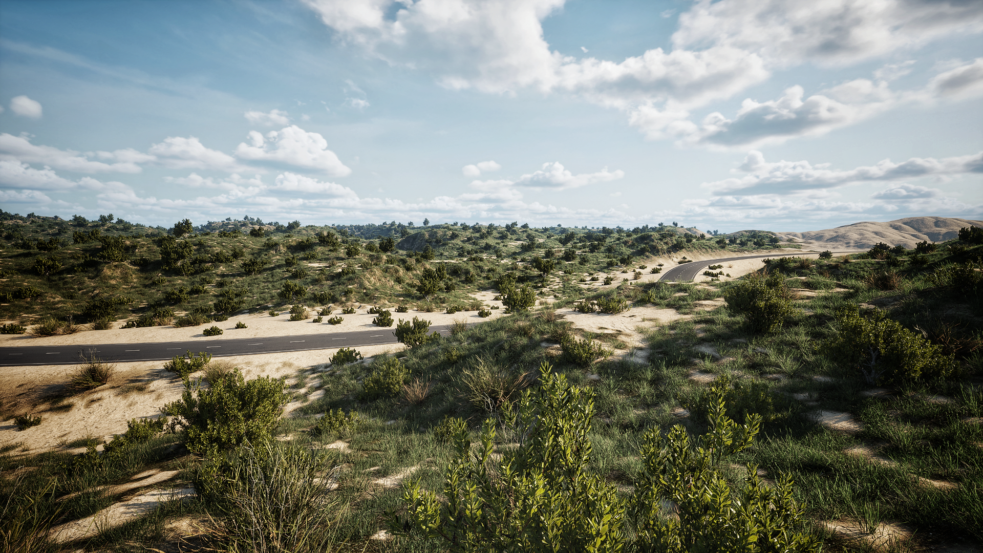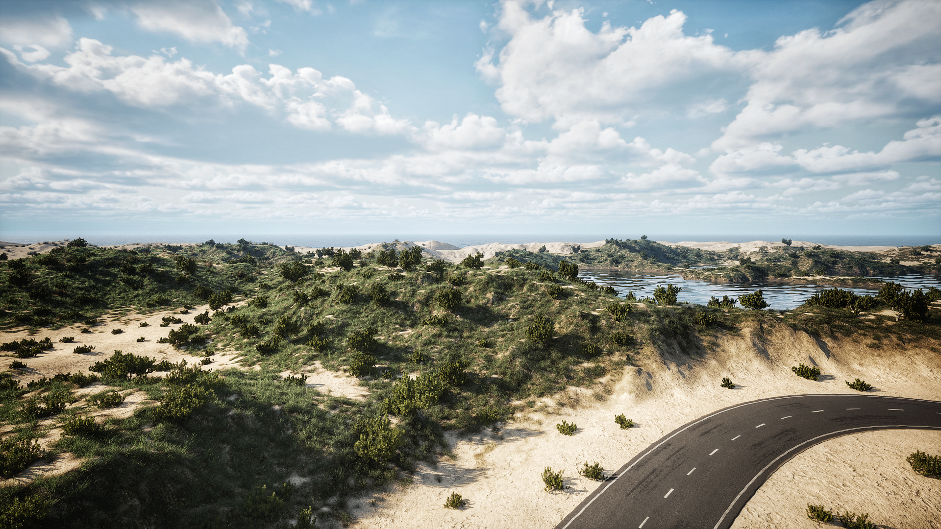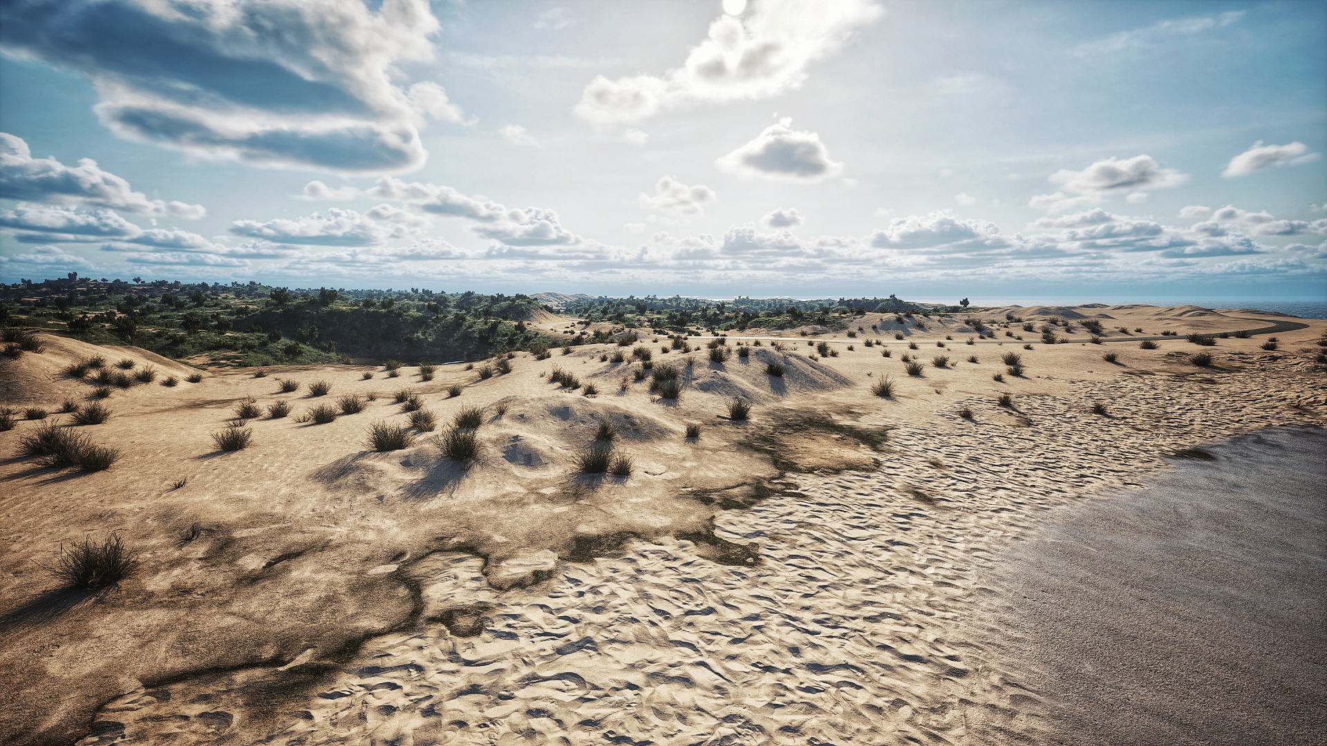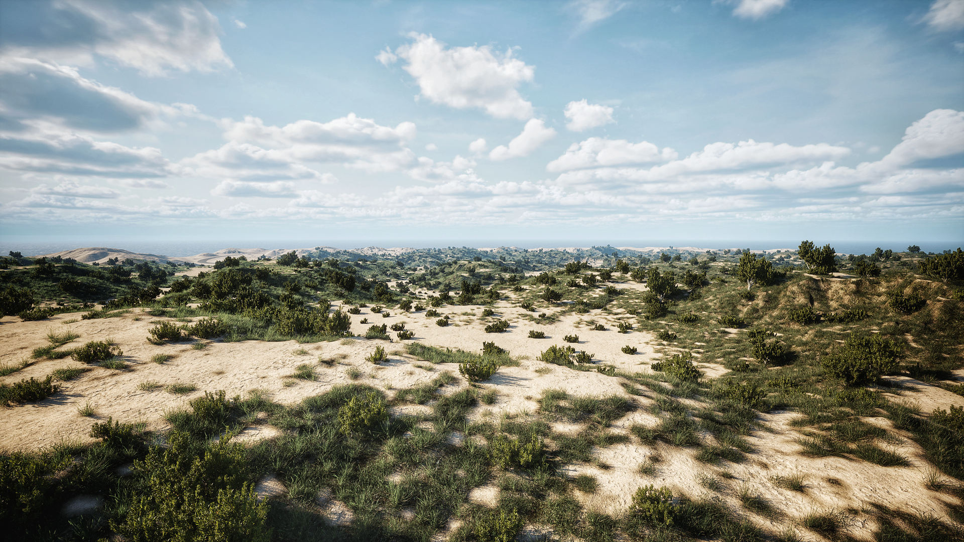 This environment was built for a client who needed multiple biomes (grasslands, bushes, sandy transition, and beach) in a single level.