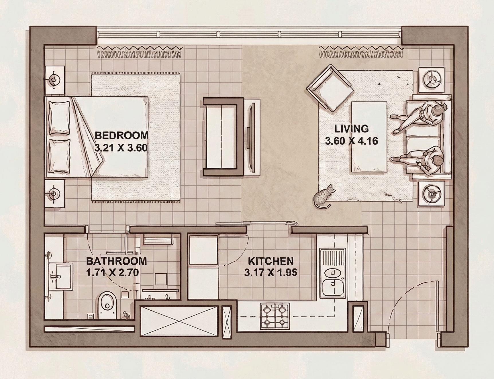 Living Room: Warm tones, natural wood, soft fabrics, and diffused daylight define the overall atmosphere